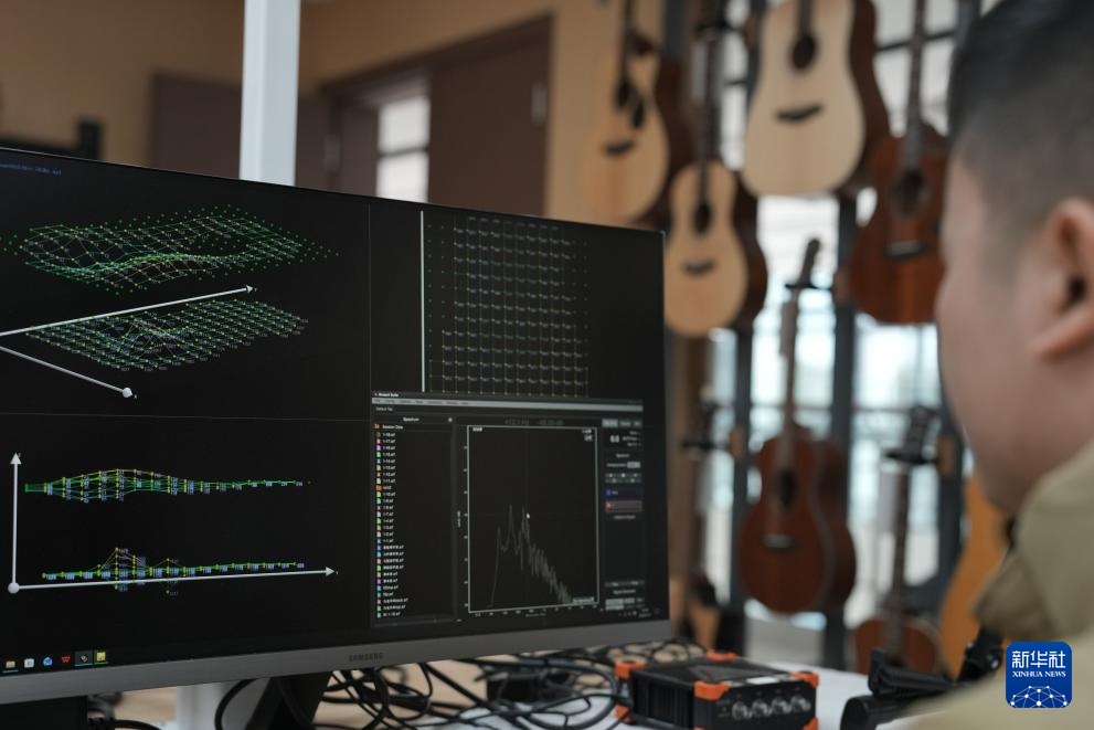 1月7日,研制人员在坐落湖南宁乡的湖南省卡玛乐器制作有限公司研制试验室调查一把吉他发声时的面板、背板振荡状况。