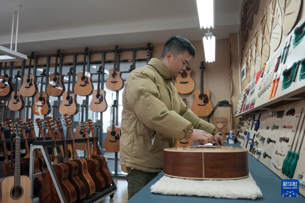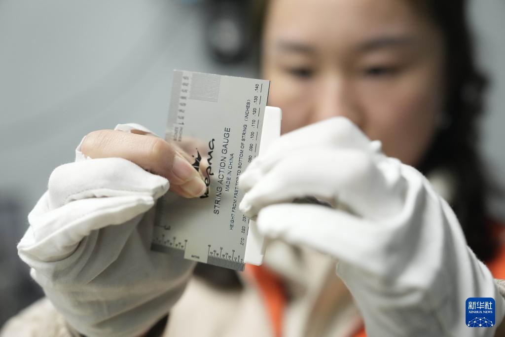 1月7日,工人在坐落湖南宁乡的湖南省卡玛乐器制作有限公司出产车间调试一把吉他。