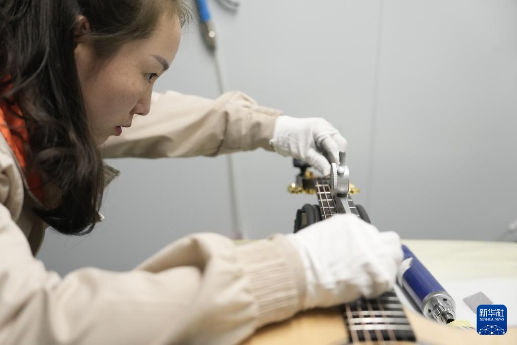 1月7日,研制人员在坐落湖南宁乡的湖南省卡玛乐器制作有限公司研制试验室调试吉他。