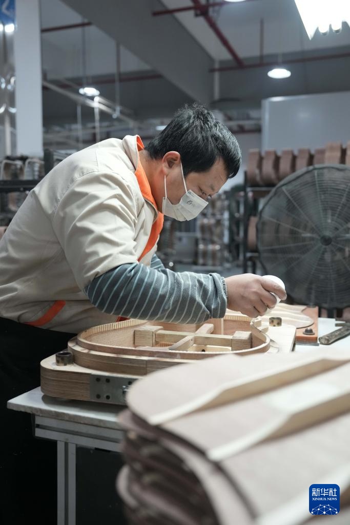 1月7日,工人在坐落湖南宁乡的湖南省卡玛乐器制作有限公司出产车间拼装吉他。