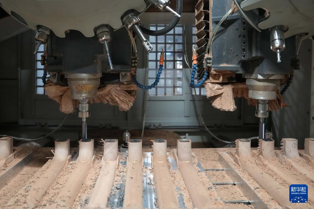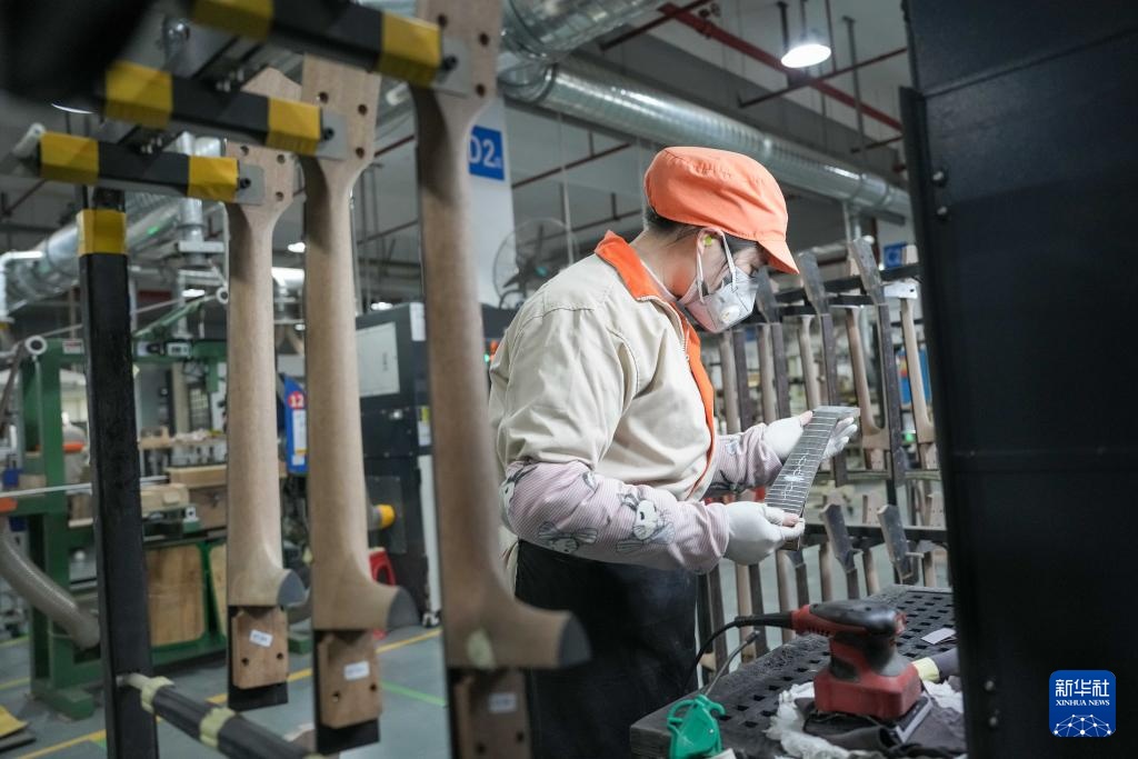 1月7日,工人在坐落湖南宁乡的湖南省卡玛乐器制作有限公司出产车间查看吉他部件。