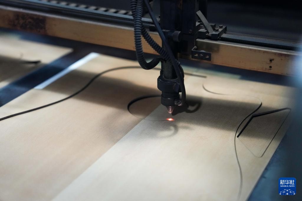 1月7日,一台激光切开机在坐落湖南宁乡的湖南省卡玛乐器制作有限公司出产车间切开吉他面板。